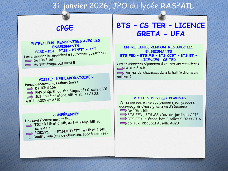 Les CPGE du lycée Raspail offrent sur Paris les options TSI, PTSI, PCSI en première année et TSI, PT, PT*, PSI en deuxième année.